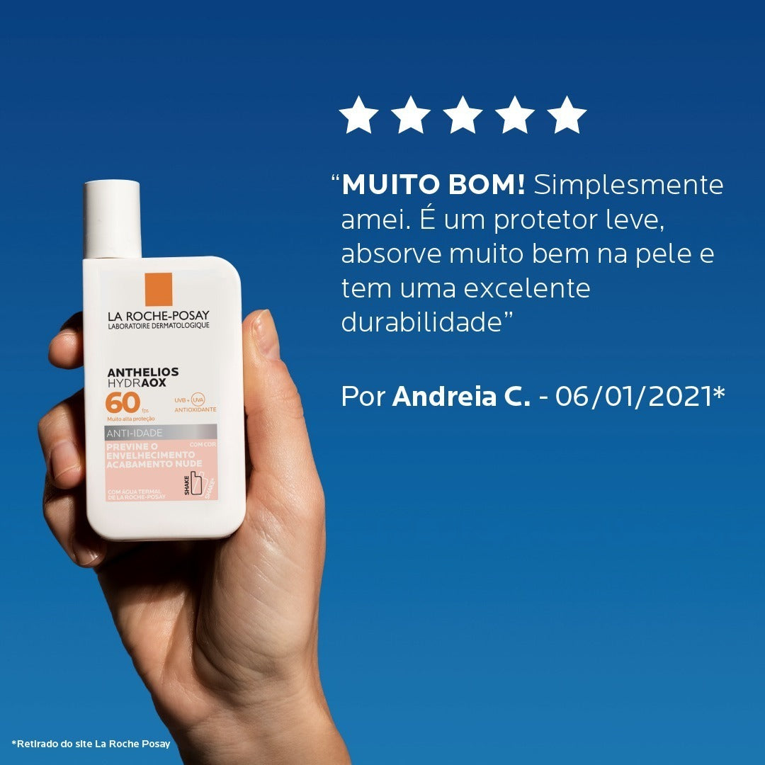 Protetor solar com cor para todos os tipos de pele. La Roche-Posay Anthelios Hydraox previne o envelhecimento e conserva o colágeno na pele.