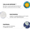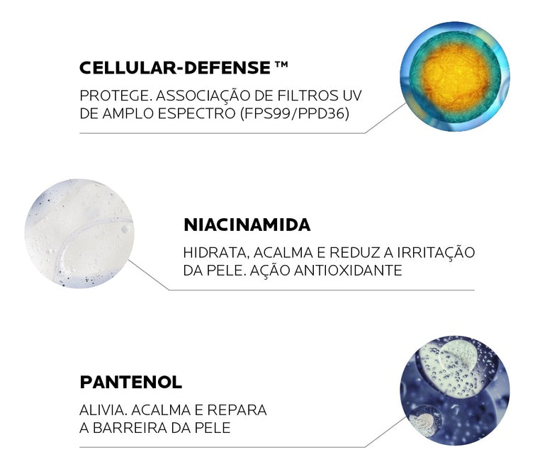 Cellular-Defense™: tecnologia patenteada exclusiva que consiste em uma associação de filtros UV de amplo espectro (SPF99/PPD36) e antioxidantes. Evita efetivamente danos por UV, fotoenvelhecimento e outras condições de pele induzidas por UV.