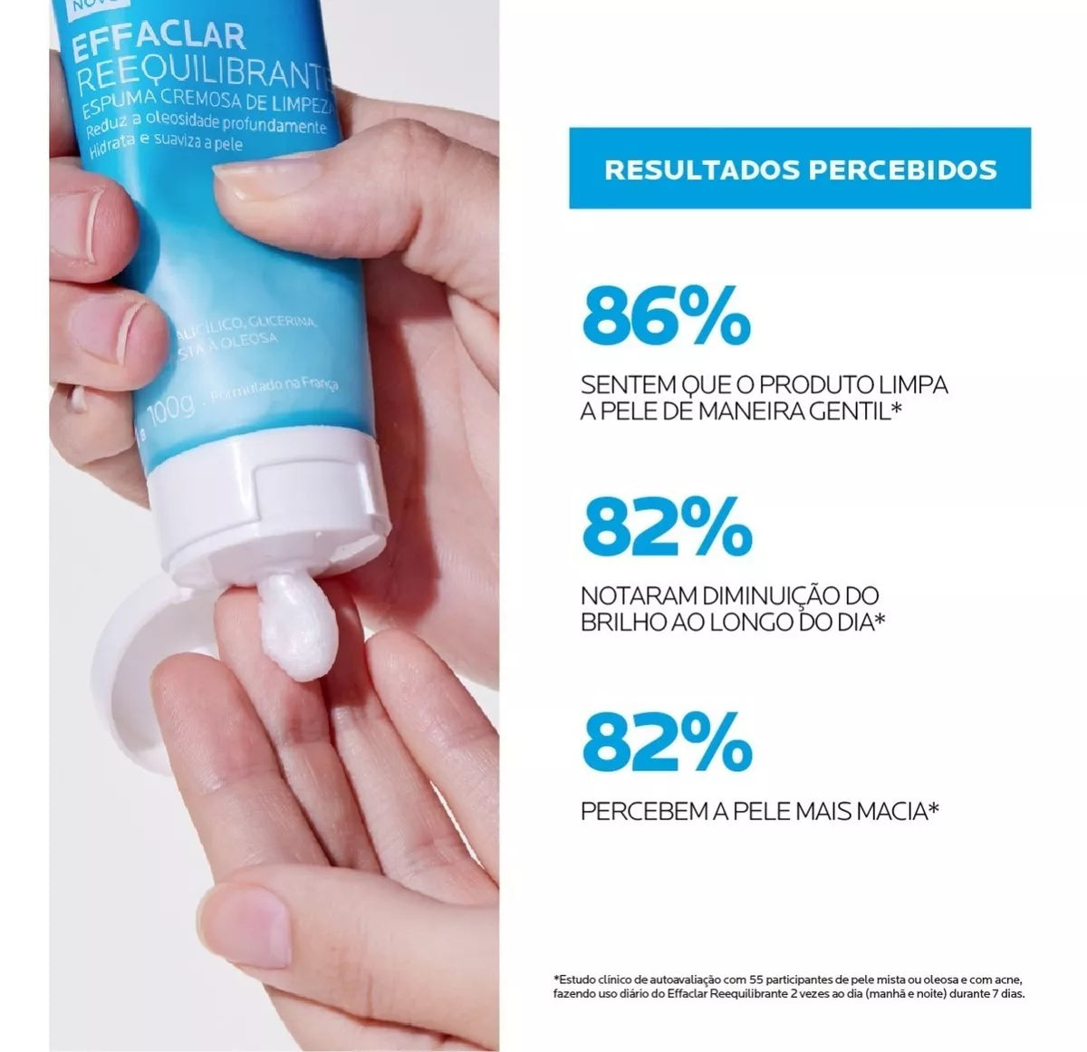 A Espuma Cremosa de Limpeza Facial La Roche-Posay Effaclar Reequilibrante conta com uma textura inovadora que higieniza na medida certa, retirando resíduos e controlando o brilho ao longo do dia. Seus resultados já são notados no primeiro uso!