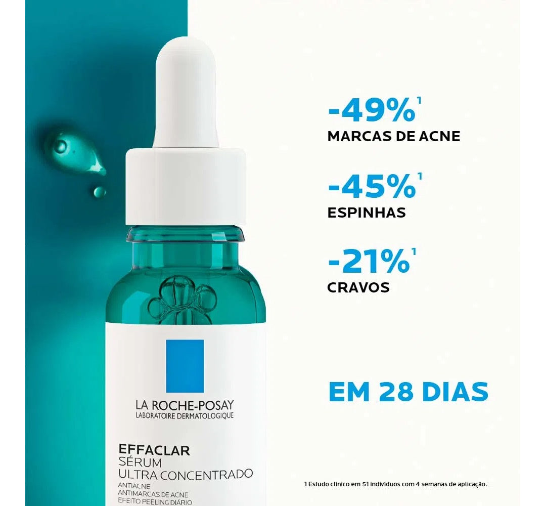 Sérum anti-acne. La Roche-Posay Effaclar Ultra Concentrado promove efeito peeling diário, foi especialmente desenvolvido para tratar e prevenir a acne, poros visíveis e marcas de acne no rosto.