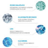 Sais de Zinco: controla a produção de queratina, desobstrui os poros, reduz a ocorrência de acne e regula a oleosidade cutânea.