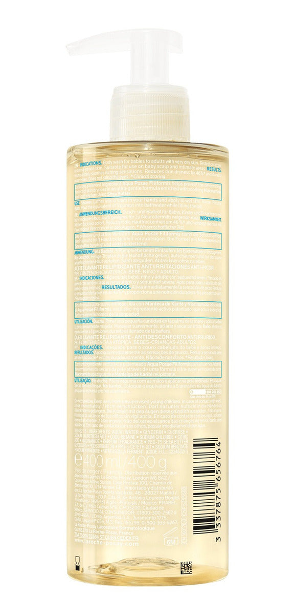La Roche-Posay Lipikar Cleansing Oil AP+ proporciona uma limpeza calmante com alta eficácia em hidratação e ação anticoceira. Sua fórmula ajuda a reequilibrar a pele e hidratar de forma duradoura para reduzir a sensação de ressecamento intenso. Adequado para bebês, crianças e adultos, pode ser usado no rosto e corpo.